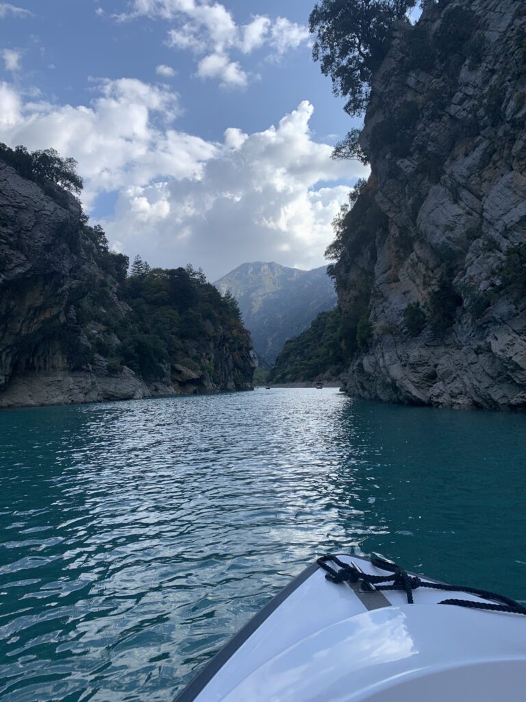 Und genau diesen schauen wir uns zunächst aus direkter Nähe an. Genauer gesagt mieten wir uns eines der zahlreichen Elektroboote am See de Sainte-Croix und gleiten damit gemütlich durch die wunderschöne Schlucht. Die Boote sind extrem langsam, was dazu führt, dass man die Landschaft in vollen Zügen genießen kann und dies aufgrund des elektrischen Antriebs weder von Lärm noch von Luftverschmutzung getrübt wird.