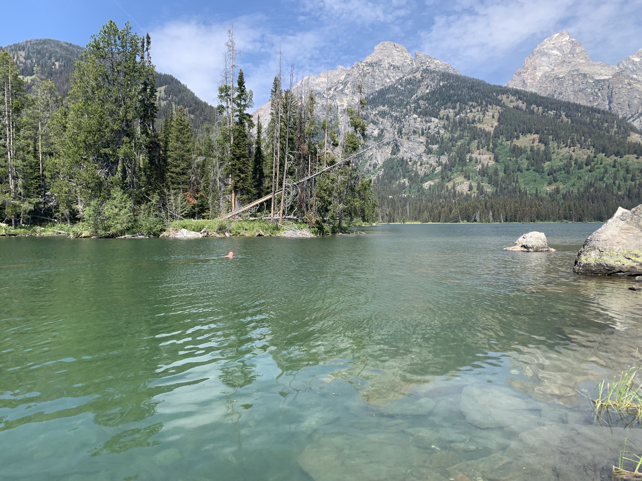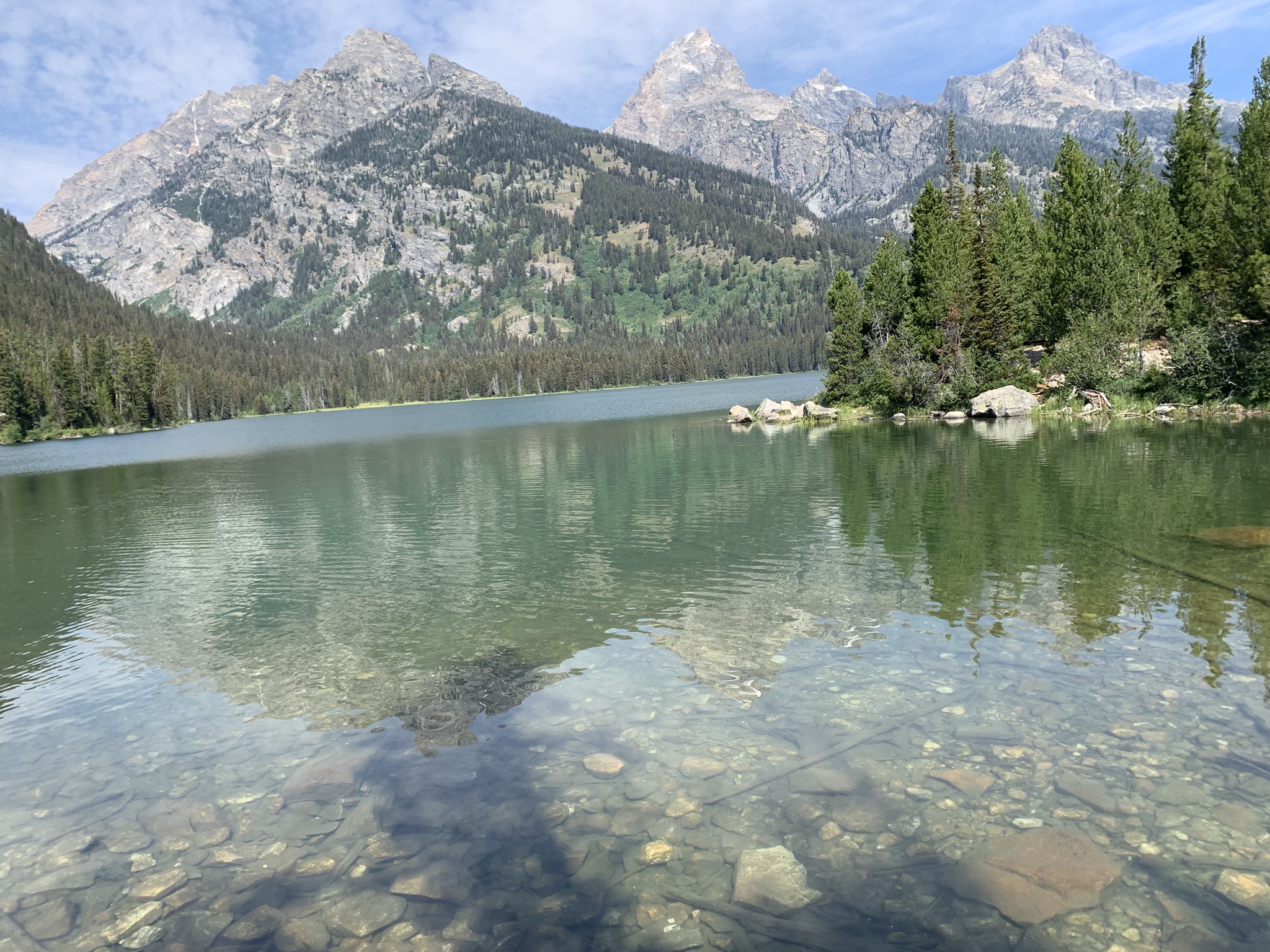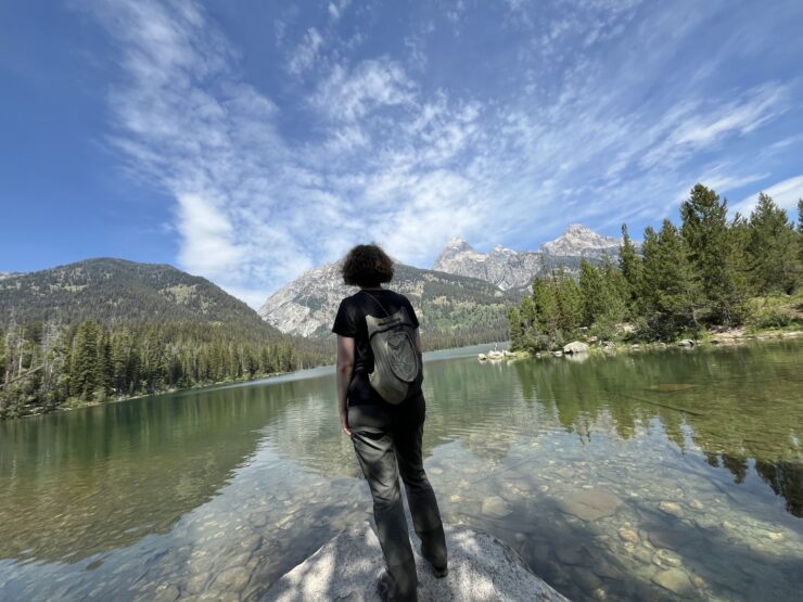Am nächsten Tag machen wir uns auf den Weg zum Two Ocean Lake Trailhead, dabei kommen wir am Jenny Lake vorbei und bereuen unsere Entscheidung nicht, den populärsten aller Seen hier auszulassen. Der Parkplatz quillt über, die Straßenränder weisen auch kein freies Plötzchen mehr auf.