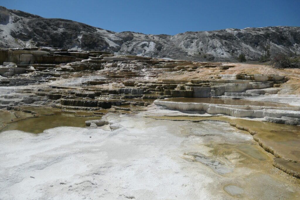 Mammoth Hot Springs soll ein einzigartiger Thermalquellenkomplex mit riesigen, farbenfrohen Kalksinterterassen hier im Nordwesten des Parks sein. Bekannt sind sie für ihre sich ständig verändernden Formationen, die durch mineralreiches, heißes Wasser entstehen, das aus dem Boden sickert. Schauen wir mal…