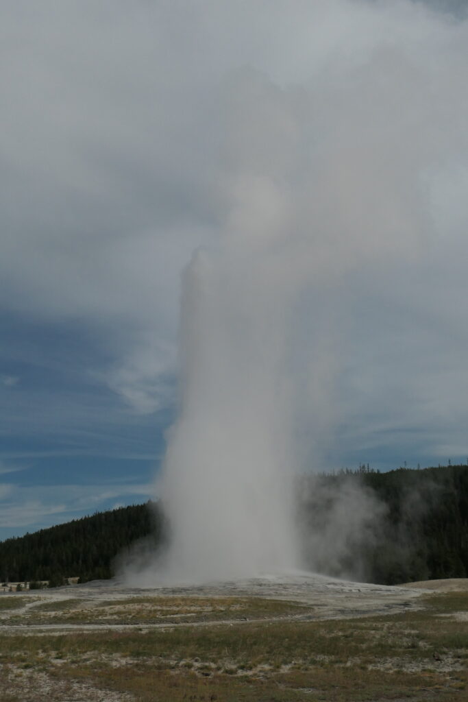 Der berühmteste Geysir im Yellowstone Nationalpark zieht nicht umsonst so viele Besucher an. Er ist einfach schier unglaublich beeindruckend wie seine Eruptionen das Wasser in bis zu 50 Meter hoch schleudern und das über mehrere Minuten lang. Aber von vorne: wir sitzen hier mit vielen anderen Menschen auf niedrigen Holzbänken um den alten Geysir herum und warten. Wir warten alle auf das gleiche: die angekündigte Eruption. Lange sehen und hören wir nichts, dann ein lautes Brodeln und wieder Stille. Kurze Zeit später grummelt die Erde und dann geht es los! Was für ein Schauspiel!