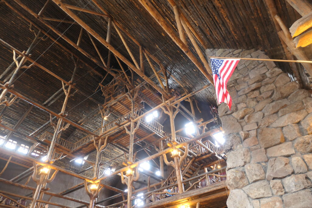 Auf dem Rückweg schauen uns das imposante Old Faithful Inn (historisches aus Holz gebautes Hotel unweit des Old Faithful Geysirs) an und bleiben gleich dort. Das Old Faitfhul Inn ist die Adresse im Yellowstone und besticht nicht nur durch seine Lage – man kann aus manchen Zimmern den Ausbruch des Geysirs beobachten – sondern auch durch die rustikale Architektur. Dieses alte Holzhaus, muss man einfach mögen, es ist unglaublich beeindruckend. Vor allem die pompöse Eingangshalle mit dem riesigen Steinkamin und der daran hängenden Uhr. Man kann von unten bis ganz oben zu den Dachgiebeln hochschauen. In der zweiten Etage kann man die Besucherterasse auch als Aussichtsplattform fürs Geysirfeld nutzen und dort in den schweren Holzstühlen seinen selbstmitgebrachten Lunch verzehren. Das war auch unser Plan. Der ändert sich allerdings schnell, als wir das preislich sehr attraktive Lunchbuffett im Dining Room unten sehen. Wir dinieren dann heute mal etwas feudaler – man muss sich schließlich mal etwas gönnen.