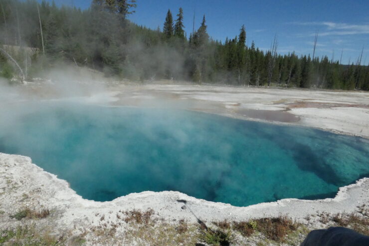 Bevor wir den Yellowstone Nationalpark am nächsten Morgen endgültig verlassen, machen wir noch einen Halt am West Thumb Geysir. Das ist ein kleinerer Teil des Parks, aber durchaus sehr sehenswert. Er ist bekannt für seine heißen Quellen, Schlammtöpfe und Geysire, die teilweise unter Wasser oder direkt in den See sprudeln, was eine magische Atmosphäre schafft. Sagen wir es mal so: wir gehen die nächsten Minuten von viel Dampf umgeben über Boardwalks und sehen uns zum Beispiel den bekannten Fishing Cone oder den Abyss Pool an. In ersterem, einer Felsformation wurden früher Fische direkt in der heißen Quelle gekocht.