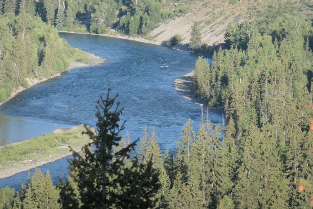 Noch vor 7 Uhr am nächsten Morgen sind wir unterwegs in Richtung Oxbox Bend – eine berühmte, hufeisenförmige Flussbiegung des Snake River, die für ihre atemberaubenden Spiegelungen des Mount Moran und die reiche Tierwelt bekannt ist. Von dem oberhalb gelegenen Overlook aus erhoffen wir uns Wildlife-Sichtungen. Wir bekommen genau einen Pelikan zu Gesicht, sonst nichts. Hätten wir vielleicht noch früher aufstehen müssen oder liegt es einfach an der Urlaubszeit und den vielen Menschen hier, dass die Tiere sich einfach zurückgezoen haben?
